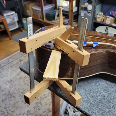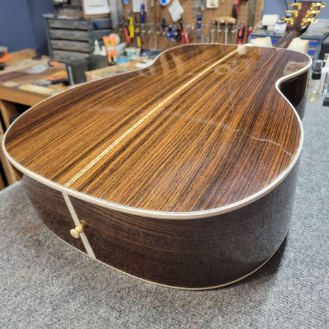 This Martin J40 sustained damage from flooding. The back had separated from the sides in a couple places along with most of the binding and a couple back braces. I re-attached them and also had to patch in a small section of binding and purfling by the neck heel.